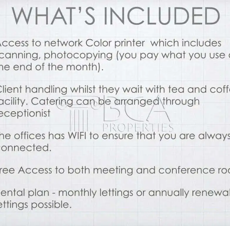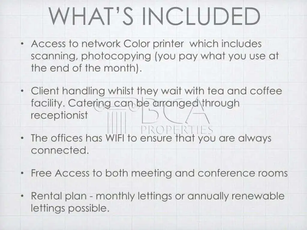 Key features included in the monthly rental are access to the network colour printer, client handling with tea and coffee facilities, WiFi connectivity, and free access to meeting and conference rooms. Rental plans are flexible, with options for short-term or long-term lease agreements.
