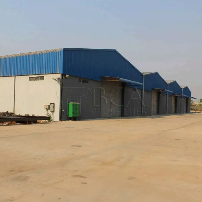 Each warehouse comes with high ceilings and wide loading bays designed for efficient goods movement. The buildings are newly constructed with concrete floors throughout, suitable for heavy equipment and racking systems. Security fencing surrounds the entire complex, with controlled vehicle access points.